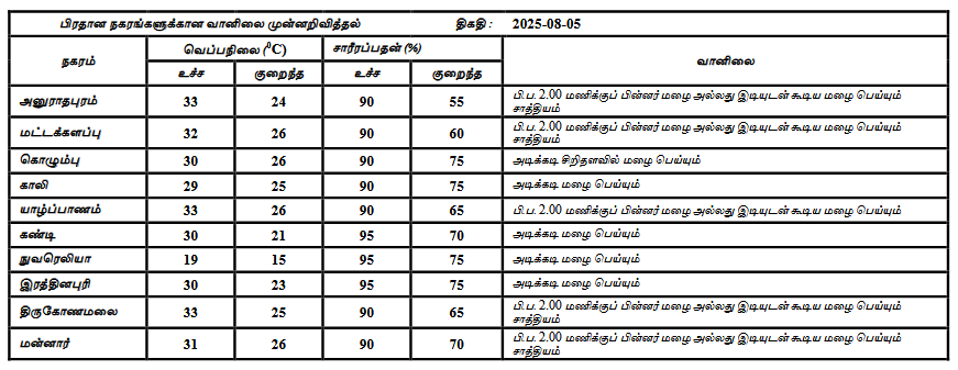 2025 ஓகஸ்ட் 05ஆம் திகதிக்கான வானிலை முன்னறிவிப்பு 2025 ஓகஸ்ட் 05ஆம் திகதி அதிகாலை 05.30 மணிக்கு வெளியிடப்பட்டது.
