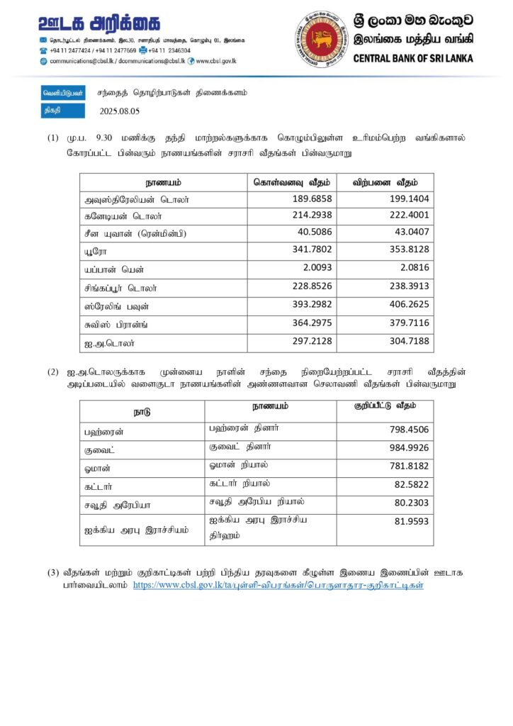 இலங்கை மத்திய வங்கி இன்று (05.08.2025) வெளியிட்டுள்ள நாணயமாற்று விகிதத்தின் அடிப்படையில்,