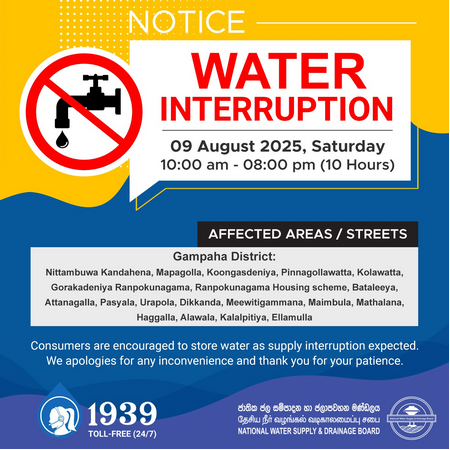இந் நீர்வெட்டு 09.08.2025 அன்று காலை 10.00 மணி முதல் இரவு 08.00 மணி வரை அமுல்படுத்தப்படவுள்ளது.