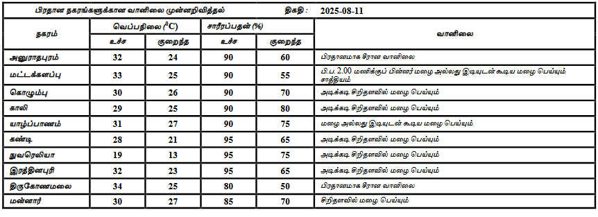 2025 ஓகஸ்ட் 11 ஆம் திகதிக்கான வானிலை முன்னறிவிப்பு 2025 ஓகஸ்ட் 11ஆம் திகதி அதிகாலை 05.30 மணிக்கு வெளியிடப்பட்டது.