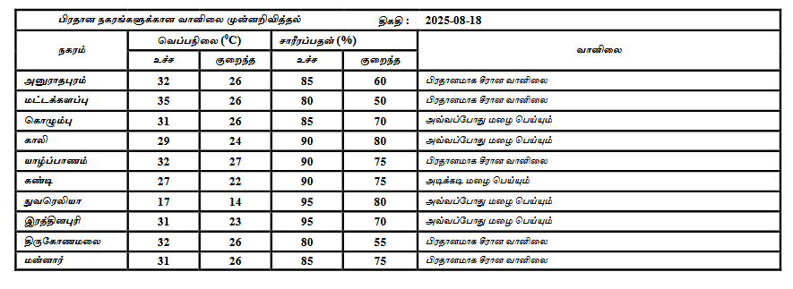 2025 ஓகஸ்ட் 18 ஆம் திகதிக்கான வானிலை முன்னறிவிப்பு 2025 ஓகஸ்ட் 18 ஆம் திகதி அதிகாலை 05.30 மணிக்கு வெளியிடப்பட்டது.