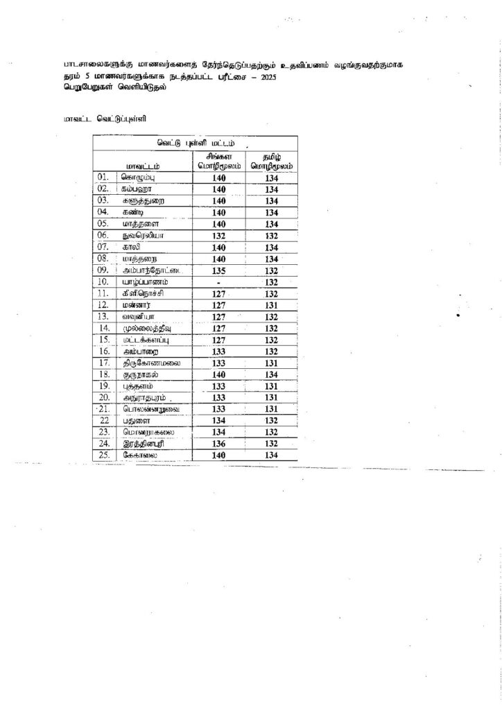 இந் நிலையில், தரம் 5 புலமைப்பரிசில் பரீட்சை பெறுபேறுகளின் அடிப்படையில் ஒவ்வொரு மாவட்டத்திற்குமான வெட்டுப்புள்ளியை பரீட்சைகள் திணைக்களம் வெளியிட்டுள்ளது.