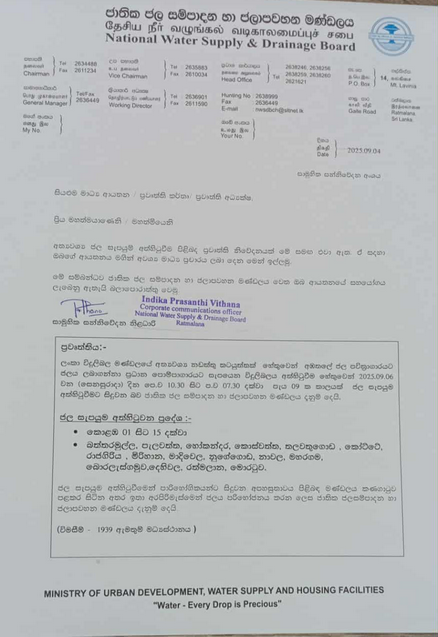 இந்த நீர்வெட்டு இம் மாதம் 06.09.2025 அன்று காலை 10.30 மணி முதல் இரவு 07.30 மணி வரை அமுல்படுத்தப்படவுள்ளது.