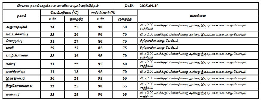 2025 செப்டம்பர் 10 ஆம் திகதிக்கான வானிலை முன்னறிவிப்பு 2025 செப்டம்பர் 10 ஆம் திகதி அதிகாலை 05.30 மணிக்கு வெளியிடப்பட்டது.