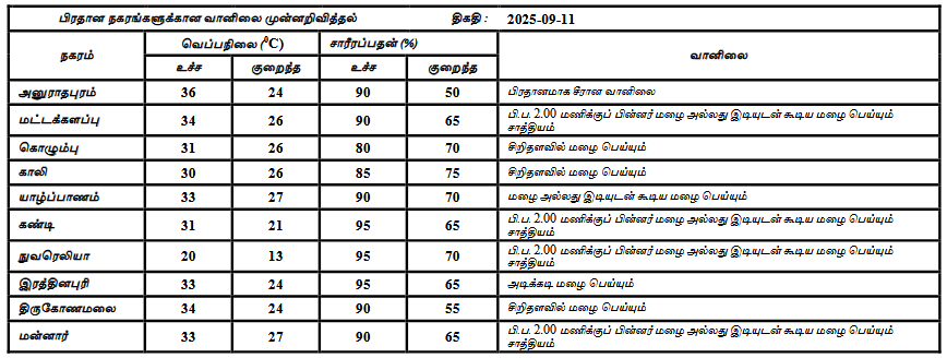 2025 செப்டம்பர் 11 ஆம் திகதிக்கான பொதுவான வானிலை முன்னறிவிப்பு 2025 செப்டம்பர் 10 ஆம் திகதி பிற்பகல் 02.00 மணிக்கு வெளியிடப்பட்டது.