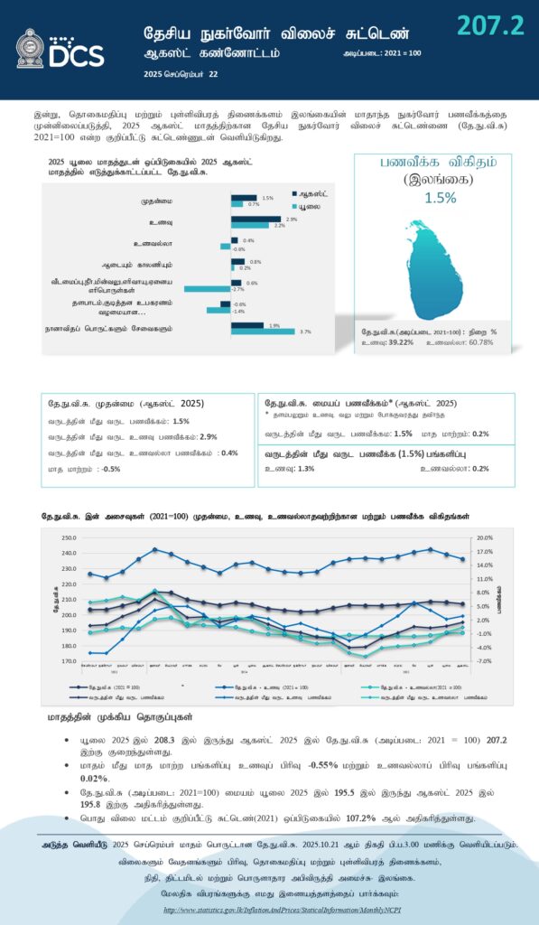 தேசிய நுகர்வோர் விலைச் சுட்டெண் (NCPI) அடிப்படையிலான ஒட்டுமொத்த முதன்மை பணவீக்கம் கடந்த ஓகஸ்ட் மாதத்தில் 1.5% ஆக அதிகரித்துள்ளது.