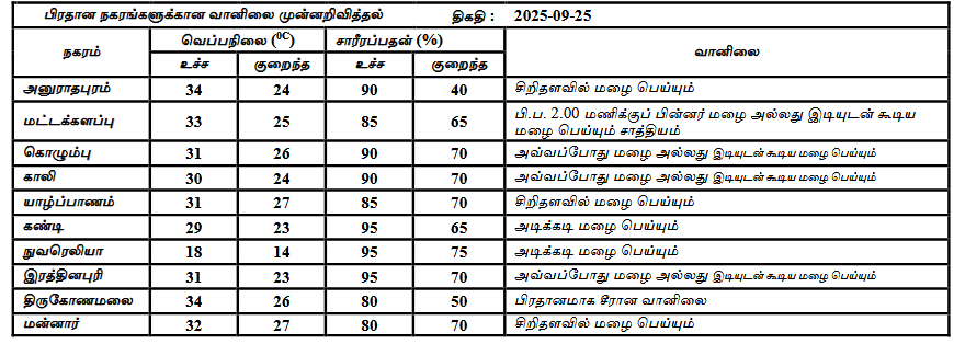 2025 செப்டம்பர் 25 ஆம் திகதிக்கான வானிலை முன்னறிவிப்பு 2025 செப்டம்பர் 25 ஆம் திகதி அதிகாலை 05.30 மணிக்கு வெளியிடப்பட்டது.