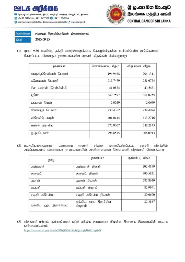 அதன்படி, ஏனைய வெளிநாட்டு நாணய மாற்று விகிதங்கள் தொடர்பாக இன்று (25.09.2025) மத்திய வங்கியினால் வெளியிடப்பட்டுள்ள தகவல்கள் கீழே தரப்பட்டுள்ளது.