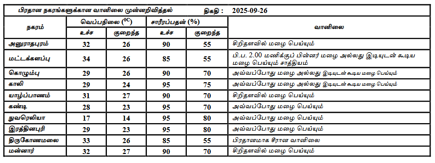 2025 செப்டம்பர் 26 ஆம் திகதிக்கான வானிலை முன்னறிவிப்பு 2025 செப்டம்பர் 26 ஆம் திகதி அதிகாலை 05.30 மணிக்கு வெளியிடப்பட்டது.