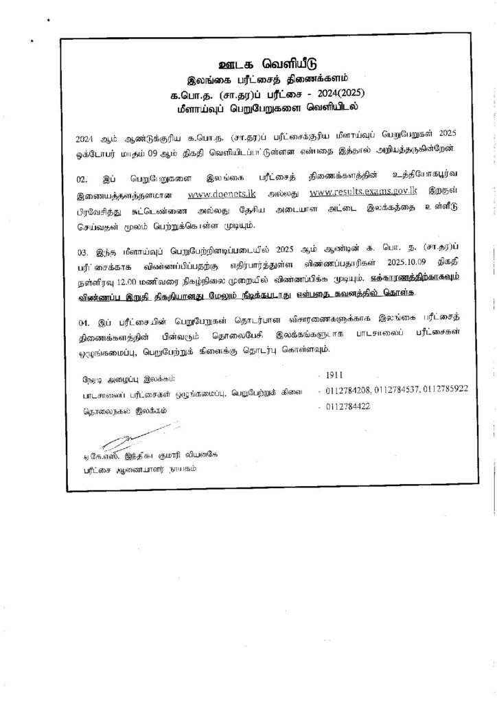 2024 ஆம் ஆண்டுக்கான க.பொ.த சாதாரண தரப் பரீட்சையின் மீள் மதிப்பீட்டுப் பெறுபேறுகள் வெளியிடப்பட்டுள்ளன.