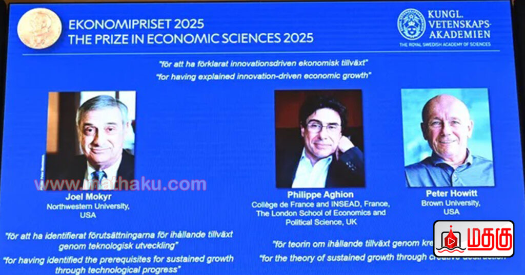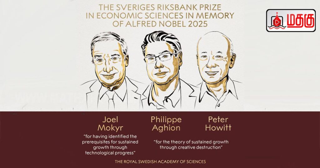 ஆல்ஃபிரட் நோபலின் நினைவாக 2025 ஆம் ஆண்டிற்கான பொருளாதார அறிவியலுக்கான ஸ்வெரிஜஸ் ரிக்ஸ்பேங்க் பரிசை “புதுமை சார்ந்த பொருளாதார வளர்ச்சியை விளக்கியதற்காக” ஜோயல் மோகிர், பிலிப் அகியோன் மற்றும் பீட்டர் ஹோவிட் ஆகியோருக்கு வழங்க தீர்மானித்துள்ளதாக ரோயல் ஸ்வீடிஷ் அகாடமி ஆஃப் சயின்சஸ் அறிவித்துள்ளது.