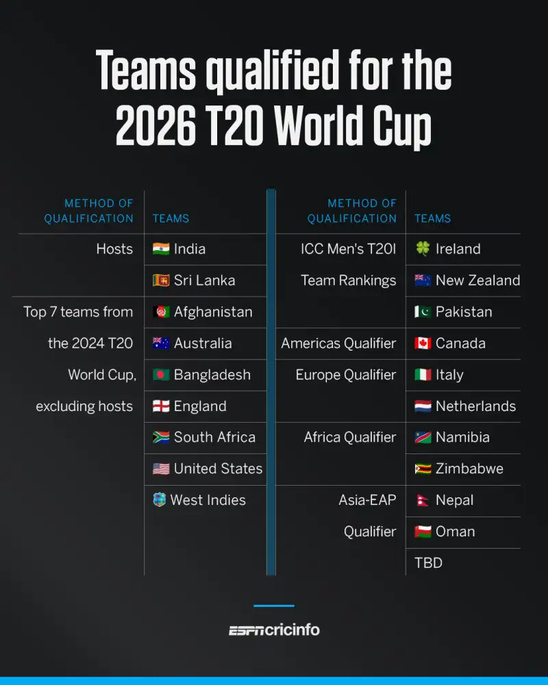 இலங்கை மற்றும் இந்தியா இணைந்து நடத்தும் 2026 ஆம் ஆண்டுகான ஐசிசி ஆண்கள் இருபதுக்கு 20 உலக கிண்ண போட்டிக்காக தகுதி பெற்ற அணிகளின் பட்டியல் அறிவிக்கப்பட்டுள்ளது.