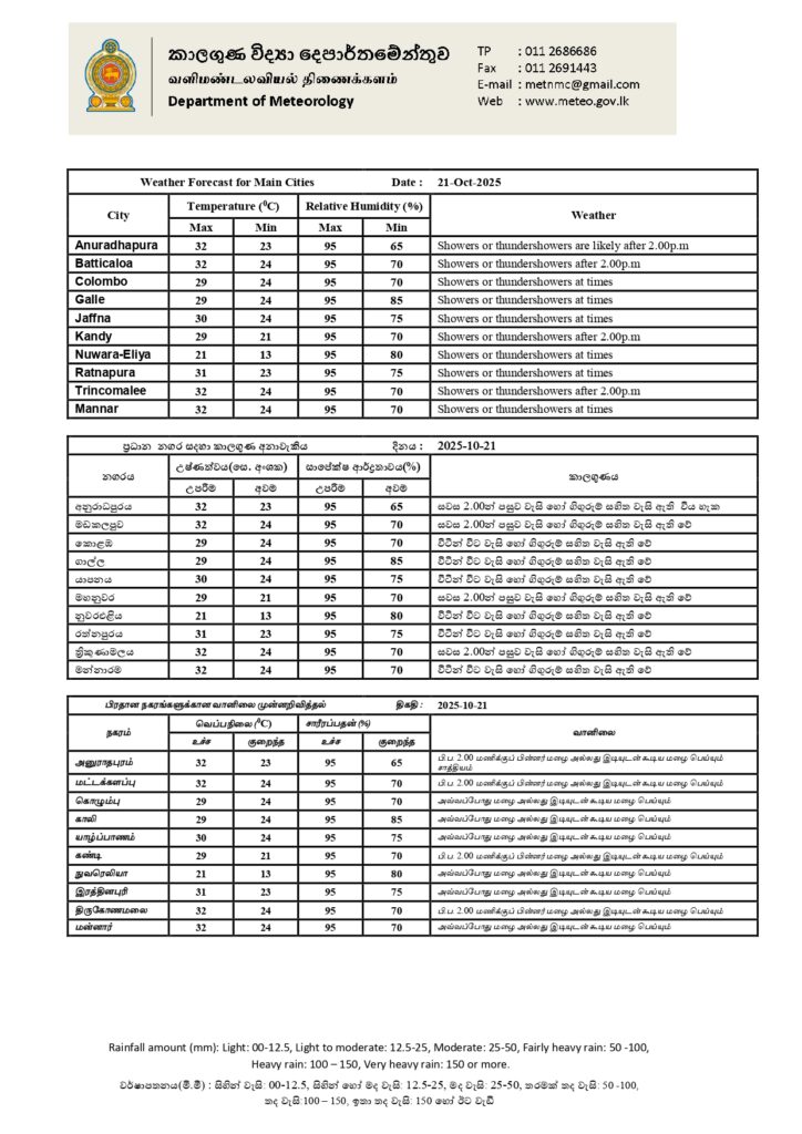 2025 ஒக்டோபர் 21ஆம் திகதிக்கான வானிலை முன்னறிவிப்பு 2025 ஒக்டோபர் 21ஆம் திகதி அதிகாலை 05.30 மணிக்கு வெளியிடப்பட்டது.