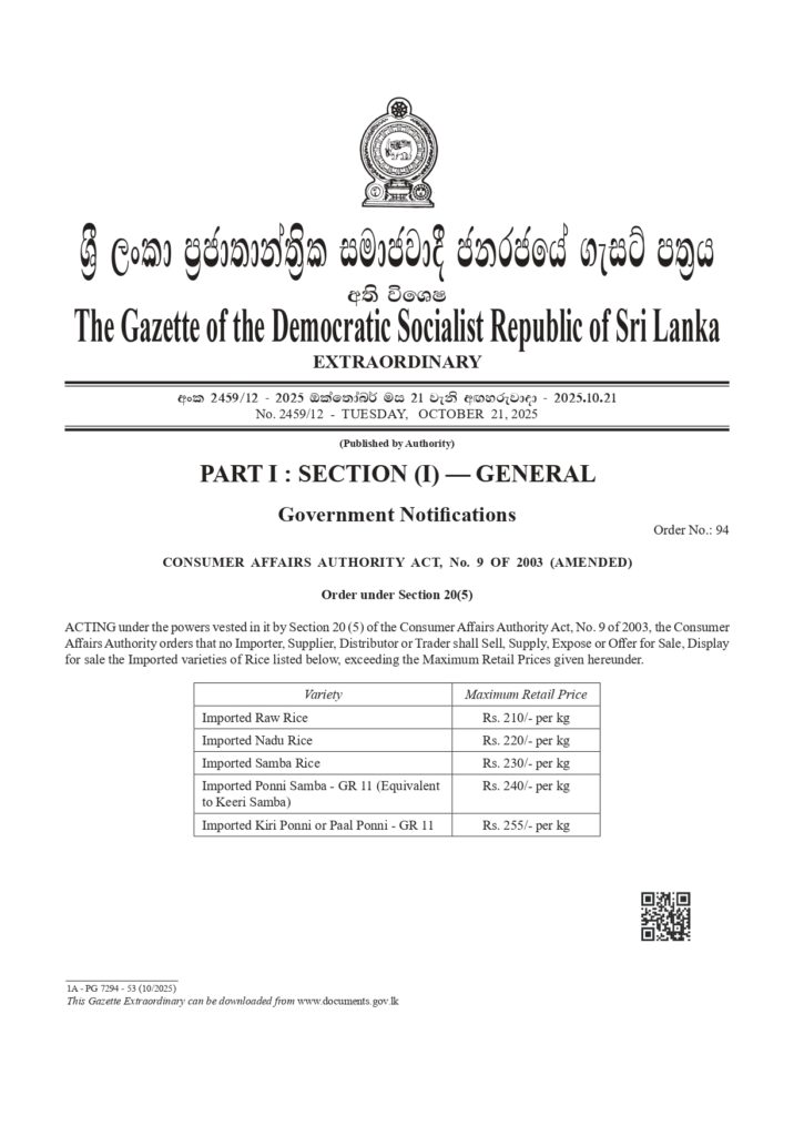 நுகர்வோர் விவகார அதிகாரசபை வெளியிட்டுள்ள வர்த்தமானி அறிவிப்பில், இந்த விலை திருத்தங்கள் 21.10.2025 அன்று முதல் அமுலுக்கு வந்துள்ளதாக குறிப்பிடப்பட்டுள்ளது.