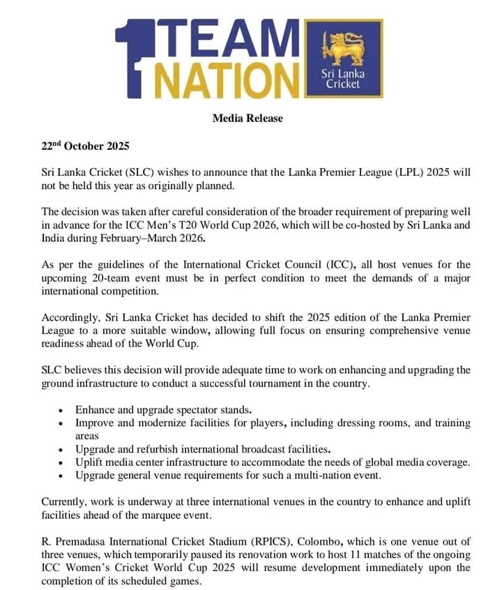 ஶ்ரீ லங்கா கிரிக்கெட் 22.10.2025 அன்று விடுத்துள்ள அறிக்கை ஒன்றில் இந்த விடயம் தெரிவிக்கப்பட்டுள்ளது.