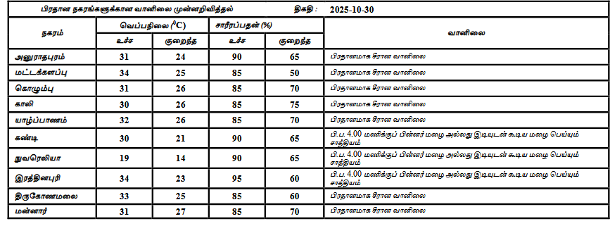 2025 ஒக்டோபர் 30ஆம் திகதிக்கான வானிலை முன்னறிவிப்பு 2025 ஒக்டோபர் 30ஆம் திகதி அதிகாலை 05.30 மணிக்கு வெளியிடப்பட்டது.