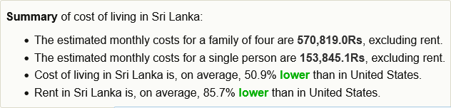 Numbeo இணையதளத்தின்படி, கொழும்பு நகரில் நான்கு பேர் கொண்ட ஒரு குடும்பத்துக்கு, வாடகை நீங்கலாக, சௌகரியமாக வாழ மாதாந்தம் ரூபா 570,997 செலவாவதாக சுட்டிக்காட்டப்பட்டுள்ளது.
