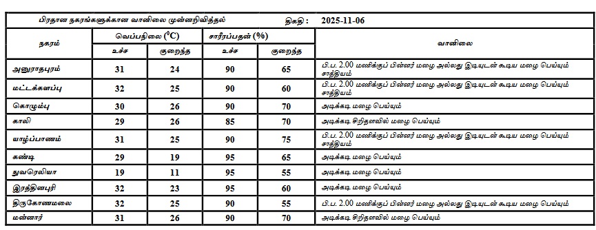 2025 நவம்பர் 06 ஆம் திகதிக்கான பொதுவான வானிலை முன்னறிவிப்பு 2025 நவம்பர் 05 ஆம் திகதி பிற்பகல் 02.00 மணிக்கு வெளியிடப்பட்டது.