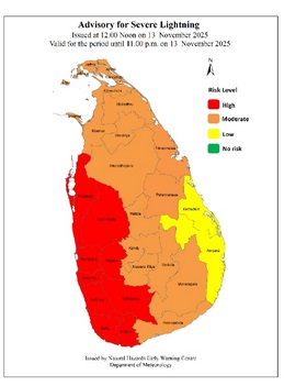 மேல், சப்ரகமுவ மற்றும் வடமேல் மாகாணங்களிலும், காலி மற்றும் மாத்தறை மாவட்டங்களிலும் இடியுடன் கூடிய மழை பெய்யும்போது கடும் மின்னல் தாக்கம் ஏற்படுவதற்கான அதிக வாய்ப்பு இருப்பதாக அத்திணைக்களம் மேலும் கூறியுள்ளது.