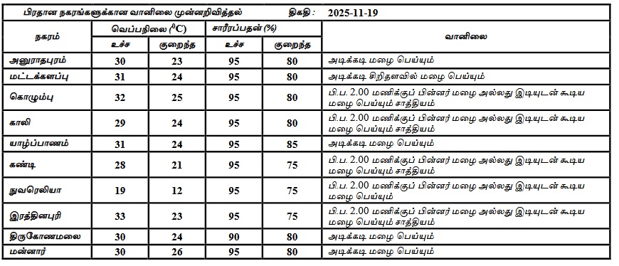 2025 நவம்பர் 19 ஆம் திகதிக்கான வானிலை முன்னறிவிப்பு 2025 நவம்பர் 19 ஆம் திகதி அதிகாலை 05.30 மணிக்கு வெளியிடப்பட்டது.