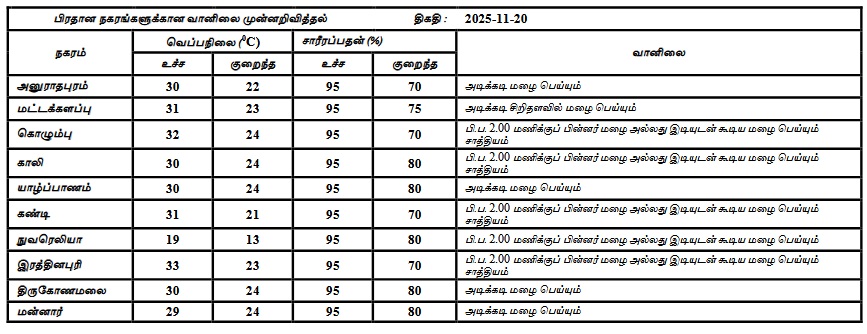 20 நவம்பர் 2025 ஆம் திகதிதிக்கான வானிலை முன்னறிவிப்பு 20 நவம்பர் 2025 அன்று காலை 05.30 மணிக்கு வெளியிடப்பட்டது