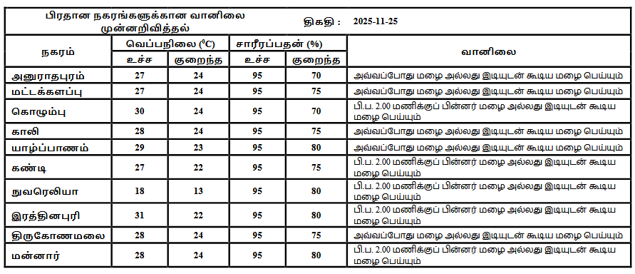 2025 நவம்பர் 25 ஆம் திகதிக்கான வானிலை முன்னறிவிப்பு 2025 நவம்பர் 25 ஆம் திகதி அதிகாலை 05.30 மணிக்கு வெளியிடப்பட்டது.