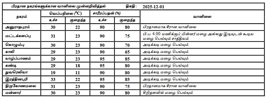 2025 டிசம்பர் 01 ஆம் திகதிக்கான வானிலை முன்னறிவிப்பு 2025 டிசம்பர் 01 ஆம் திகதி காலை 05.30 மணிக்கு வெளியிடப்பட்டது