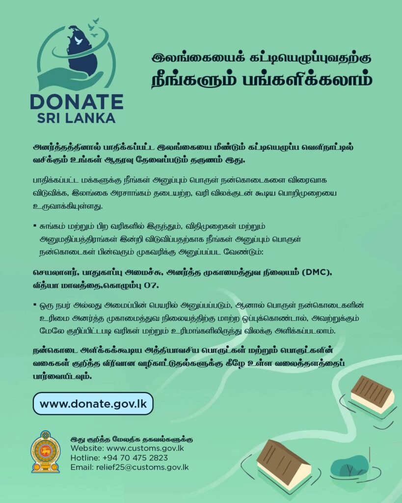 நன்கொடைகள் தொடர்பான வழிகாட்டுதல்களை www.customs.gov.lk என்ற இணையத்தளத்தைப் பார்வையிடுவதன் மூலமும், அத்தியாவசியப் பொருட்களின் வகைகள் குறித்த விரிவான விபரங்களை www.donate.gov.lk இணையத்தளத்திலும் பெற்றுக்கொள்ளலாம்.