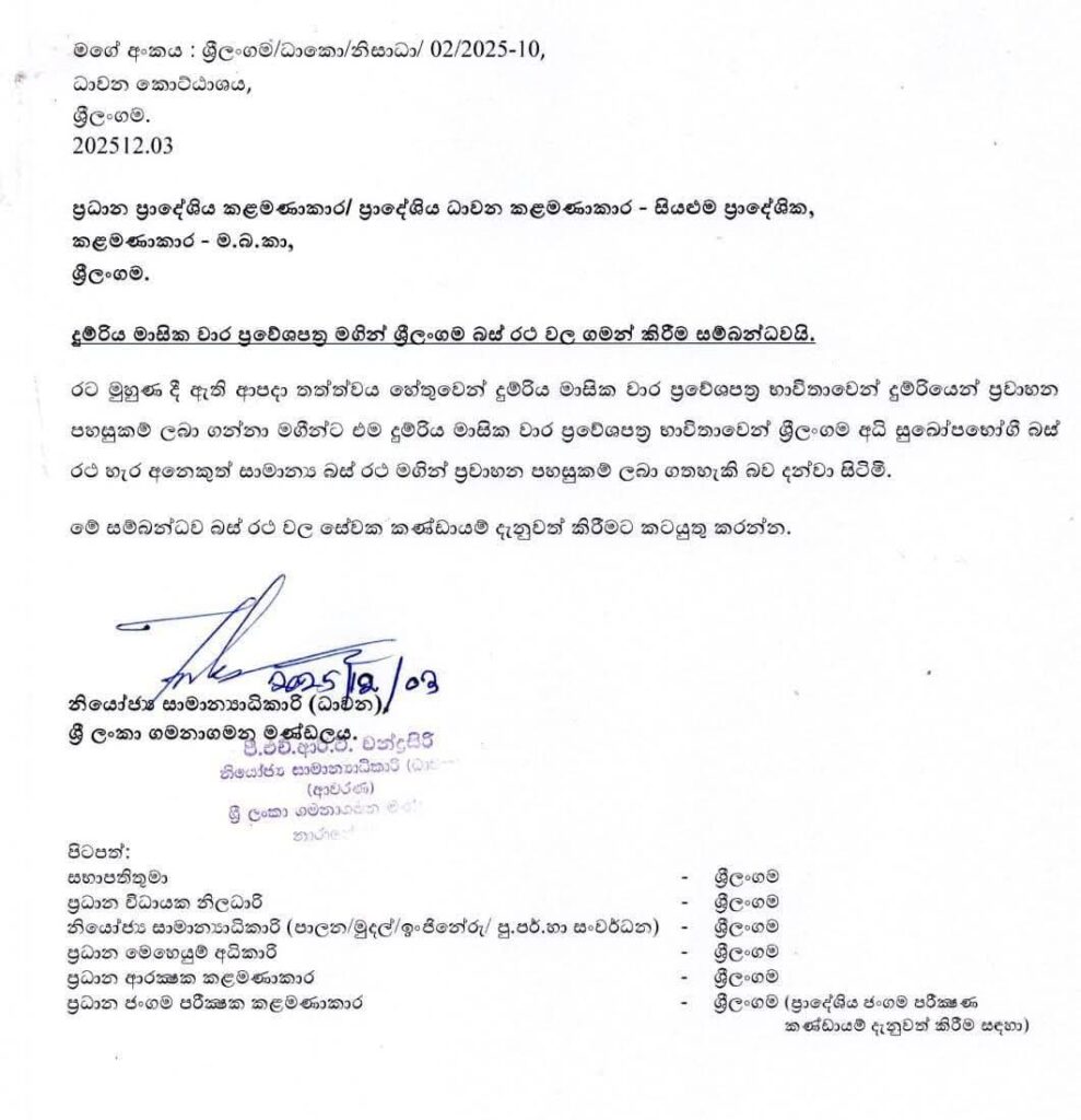 டித்வா சூறாவளியினால் நாட்டில் நிலவிய அனர்த்த நிலைமை காரணமாக, புகையிரத மாதாந்த பருவச்சீட்டைக் கொண்டு இலங்கை போக்குவரத்து சபைக்கு சொந்தமான பேருந்துகளில் பயணிப்பதற்கான சந்தர்ப்பம் வழங்கப்பட்டுள்ளதாக இலங்கை போக்குவரத்து சபை தலைவர் தெரிவித்துள்ளார்.