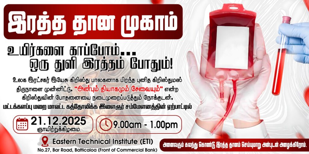 “உயிர்களை காப்போம் ஒரு துளி இரத்தம் போதும்” எனும் தொனிப்பொருளில் மட்டக்களப்பு மறை மாவட்ட கத்தோலிக்க இளைஞர் சம்மேளனத்தின் ஏற்பாட்டில் இரத்த தான நிகழ்வு ஒன்று நடைபெறவுள்ளது.