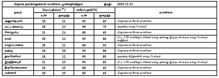 2025 டிசம்பர் 22 ஆம் திகதிக்கான வானிலை முன்னறிவிப்பு 2025 டிசம்பர் 22 ஆம் திகதி அதிகாலை 05.30 மணிக்கு வெளியிடப்பட்டது.