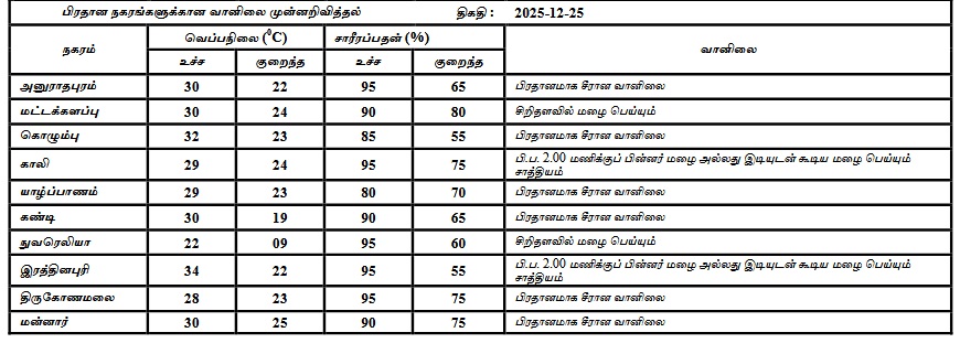 2025 டிசம்பர் 25 ஆம் திகதிக்கான வானிலை முன்னறிவிப்பு 2025 டிசம்பர் 25 ஆம் திகதி அதிகாலை 05.30 மணிக்கு வெளியிடப்பட்டது.