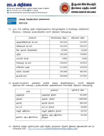 இலங்கை மத்திய வங்கி இன்று (26.12.2025) வெளியிட்டுள்ள நாணய மாற்று விகிதத்தின் அடிப்படையில்,