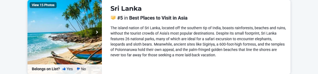 “இந்தியாவின் தெற்கு முனையில் அமைந்துள்ள தீவு நாடான இலங்கை, ஆசியாவின் மிகவும் பிரபலமான சுற்றுலாத் தலங்கள், மழைக்காடுகள், கடற்கரைகள் மற்றும் இடிபாடுகளைக் கொண்டுள்ளது.