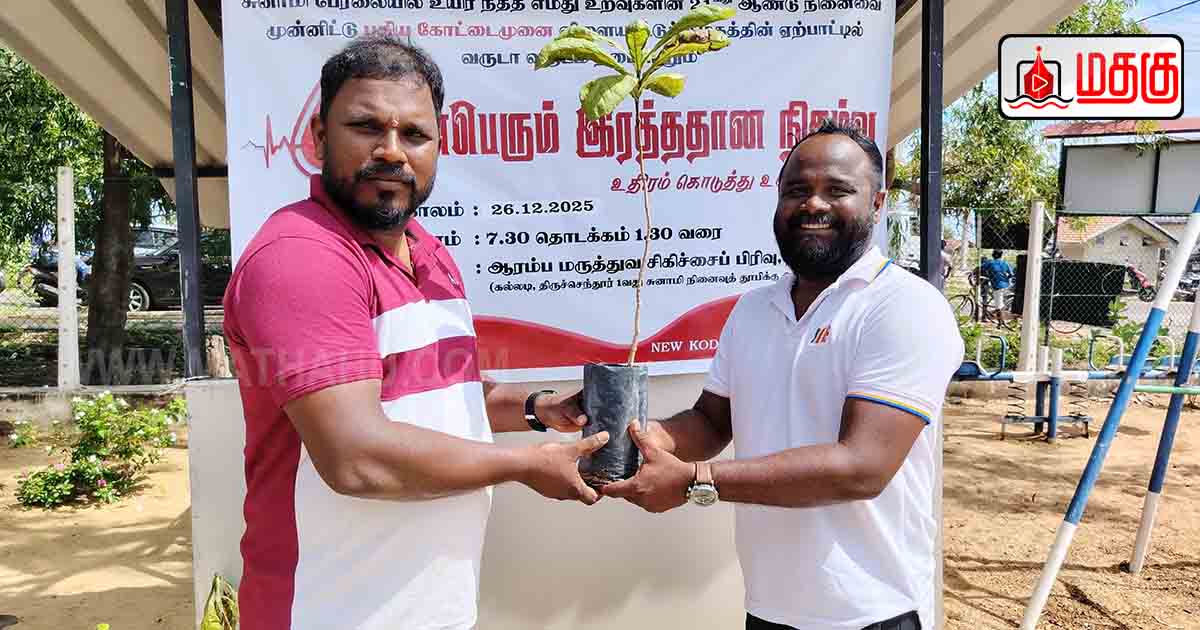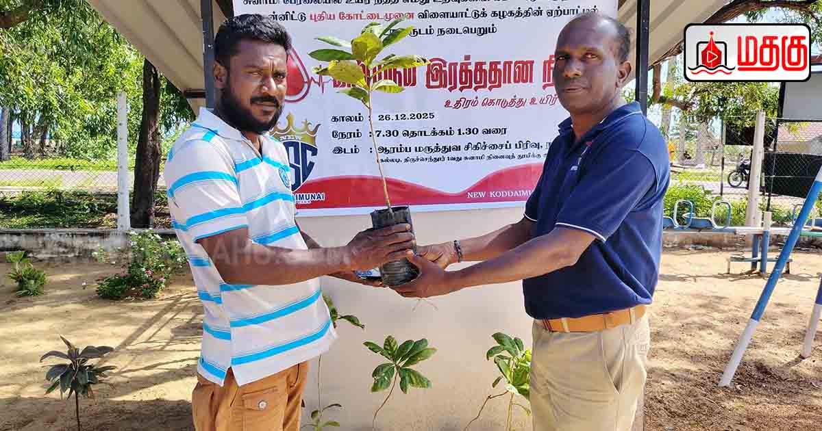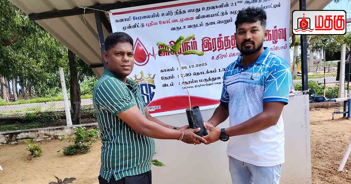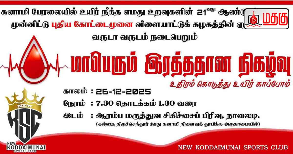 மட்டக்களப்பு புதிய கோட்டைமுனை விளையாட்டுக் கழகத்தின் ஏற்பாட்டில், “உதிரம் கொடுத்து உயிர் காப்போம்” எனும் தொனிப்பொருளில் சுனாமிப் பேரலையால் உயிர்நீர்த்த உறவுகளின் நினைவாக வருடாவருடம் தொடர்ச்சியாக நடைபெறும் இரத்ததான முகாம் கழகத்தின் தலைவர் ஜெ.சிந்துஜனின் தலைமையில் மட்டக்களப்பு கல்லடி பிரதேசத்தில் அமைந்துள்ள நாவலடி ஆரம்ப மருத்துவ சிகிச்சைப்பிரிவில் (கல்லடி திருச்செந்தூர் 01 ஆவது சுனாமி நினைவுத் தூபிக்கு அருகாமையில்) 25.12.2025 அன்று நடைபெற்றது.