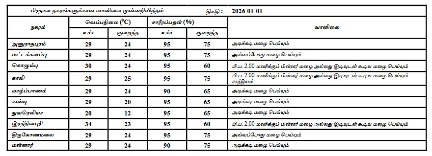 2026 ஜனவரி 01 ஆம் திகதிக்கான வானிலை முன்னறிவிப்பு 2026 ஜனவரி 01 ஆம் திகதி காலை 05.30 மணிக்கு வெளியிடப்பட்டது