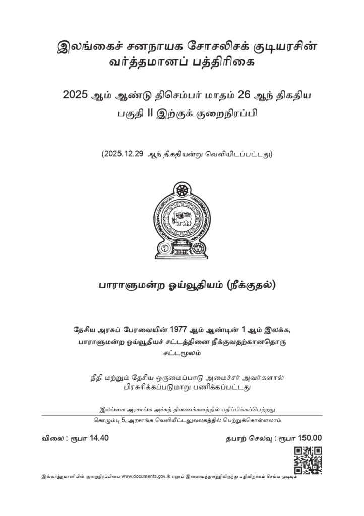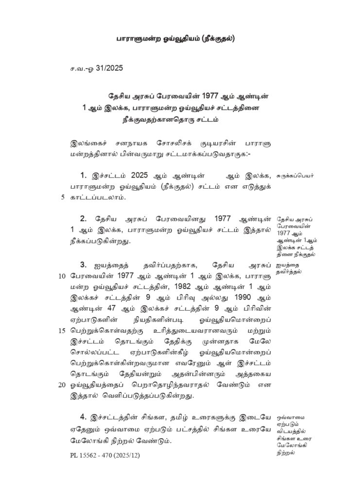 தேசிய அரசுப் பேரவையின் 1977 ஆம் ஆண்டின் 1 ஆம் இலக்க பாராளுமன்ற ஓய்வூதியங்கள் சட்டத்தை இரத்துச் செய்வதற்கான, பாராளுமன்ற ஓய்வூதியம் (நீக்குதல்) சட்டமூலம் வர்த்தமானியில் வெளியிடப்பட்டுள்ளது.