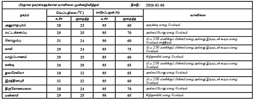 2026 ஜனவரி 06 ஆம் திகதிக்கான வானிலை முன்னறிவிப்பு 2026 ஜனவரி 06 ஆம் திகதி காலை 05.30 மணிக்கு வெளியிடப்பட்டது
