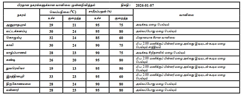 2026 ஜனவரி 07 ஆம் திகதிக்கான வானிலை முன்னறிவிப்பு 2026 ஜனவரி 07ஆம் திகதி அதிகாலை 05.30 மணிக்கு வெளியிடப்பட்டது.