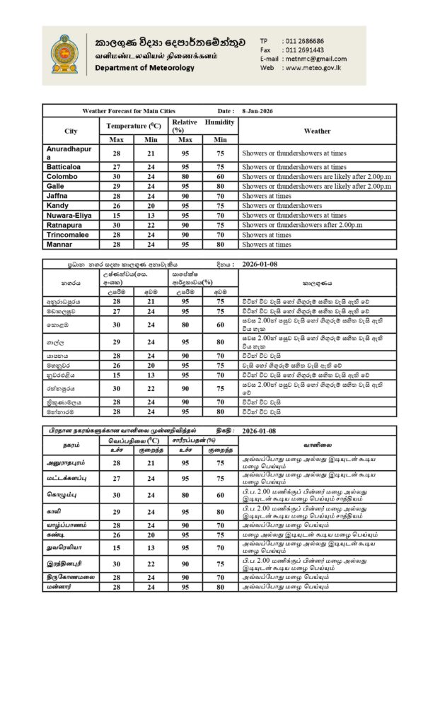 2026 ஜனவரி 08 ஆம் திகதிக்கான வானிலை முன்னறிவிப்பு 2026 ஜனவரி 08 ஆம் திகதி அதிகாலை 05.30 மணிக்கு வெளியிடப்பட்டது.