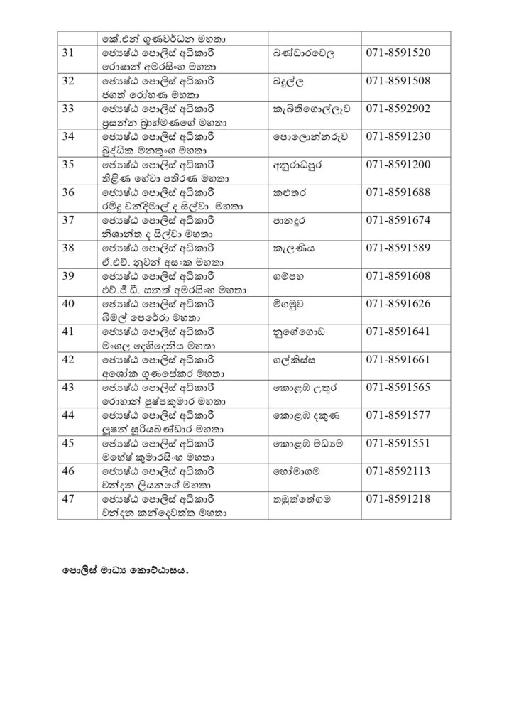 அதற்கமைய, கீழே உள்ள தொலைபேசி இலக்கங்கள் ஊடாக பொலிஸ் பிரிவுகளுக்குப் பொறுப்பான அதிகாரிகளுக்குத் தகவல்களை வழங்க முடியும்.