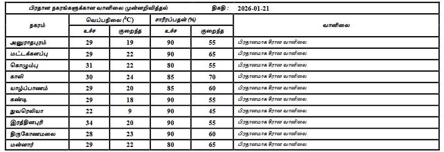 2026 ஜனவரி 21 ஆம் திகதிக்கான வானிலை முன்னறிவிப்பு 2026 ஜனவரி 21 ஆம் திகதி அதிகாலை 05.30 மணிக்கு வெளியிடப்பட்டது.