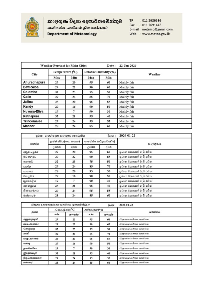 2026 ஜனவரி 22ஆம் திகதிக்கான வானிலை முன்னறிவிப்பு 2026 ஜனவரி 22ஆம் திகதி அதிகாலை 05.30 மணிக்கு வெளியிடப்பட்டது.