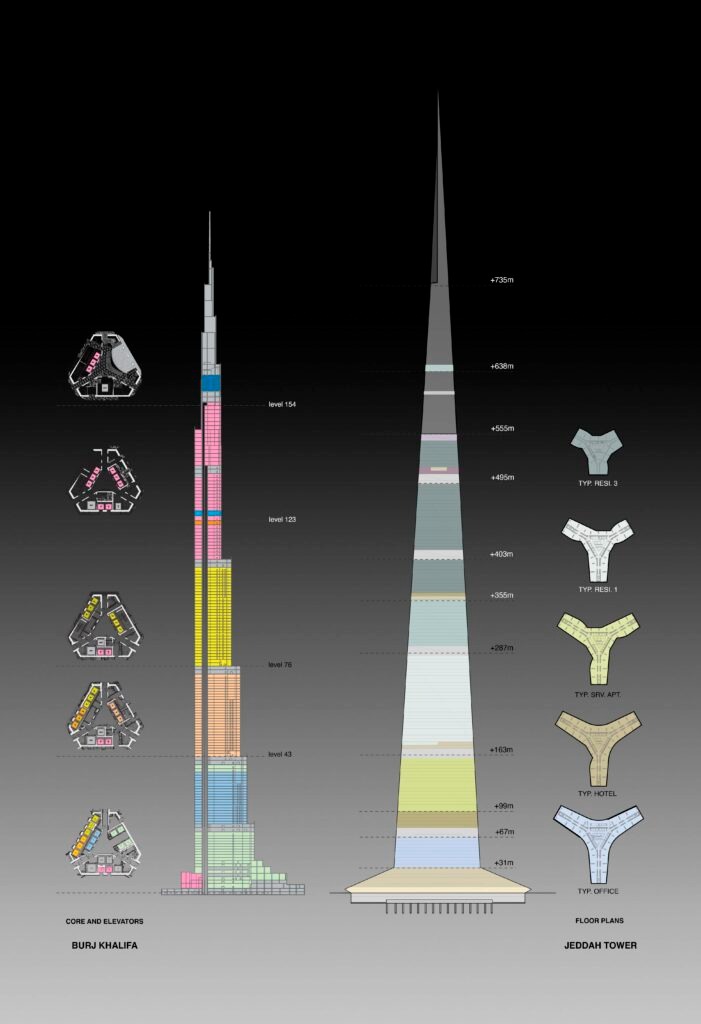 டுபாயில் அமைந்துள்ள புர்ஜ் கலீபா 828 மீற்றர் (2,717 அடி) உயரத்துடன் தற்போது உலகின் உயரமான கட்டடமாக உள்ளது. ஜெட்டா டவர் 1,000 மீற்றரைத் தாண்டும் உயரத்தில் கட்டப்படுவதால், இந்த சாதனை முறியடிக்கப்படும் என்பது உறுதியாகியுள்ளது.