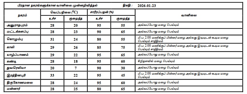 2026 ஜனவரி 23 ஆம் திகதிக்கான வானிலை முன்னறிவிப்பு 2026 ஜனவரி 23 ஆம் திகதி அதிகாலை 05.30 மணிக்கு வெளியிடப்பட்டது.