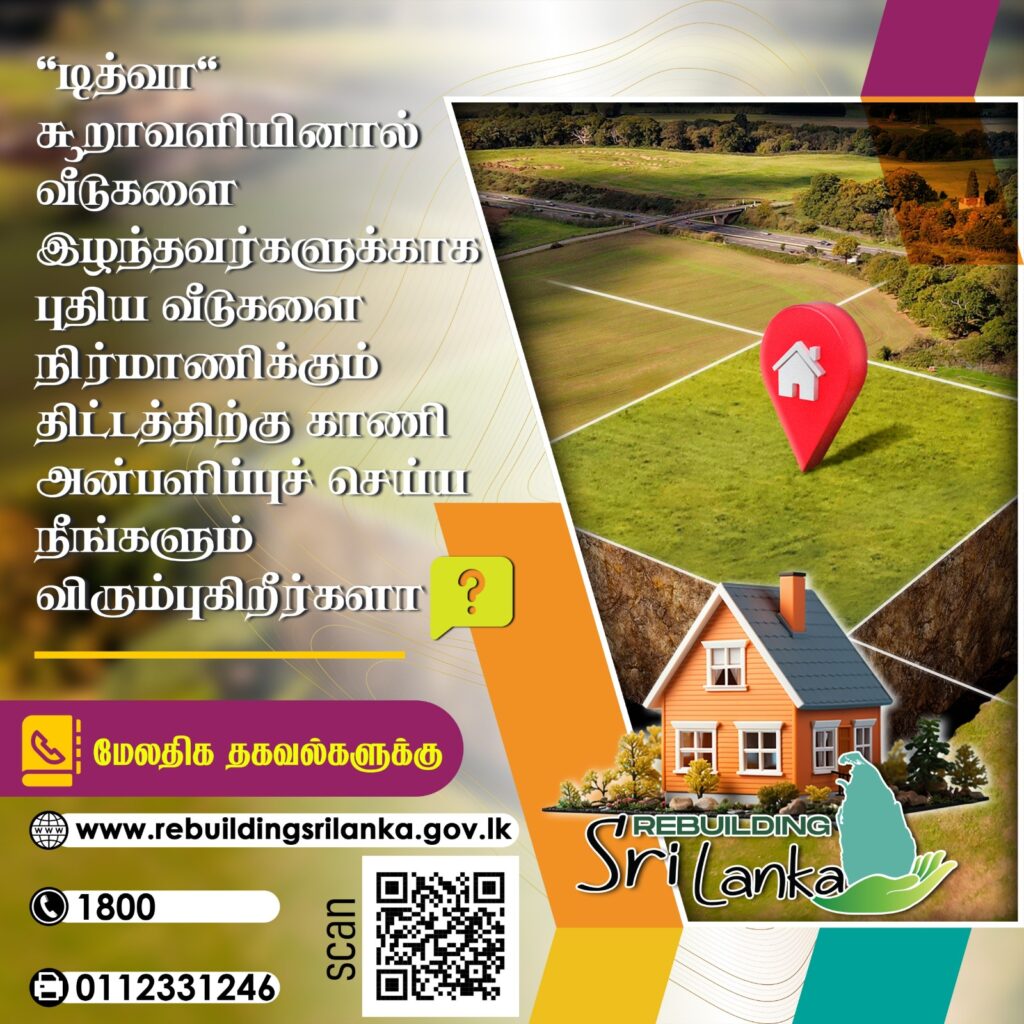 ‘டித்வா சூறாவளியால்’ ஏற்பட்ட அனர்த்தத்தில் முழுமையாக வீடுகள் சேதமடைந்த குடும்பங்களுக்காக வீடுகளை நிர்மாணித்துக் கொடுக்கும் திட்டம் தற்போது முன்னெடுக்கப்பட்டு வருவதுடன், அவ்வீடுகளை நிர்மாணிப்பதற்குத் தேவையான காணிகளை அன்பளிப்புச் செய்வதற்கு நாடளாவிய ரீதியிலுள்ள நன்கொடையாளர்களுக்கு சந்தர்ப்பம் வழங்கப்பட்டுள்ளது.