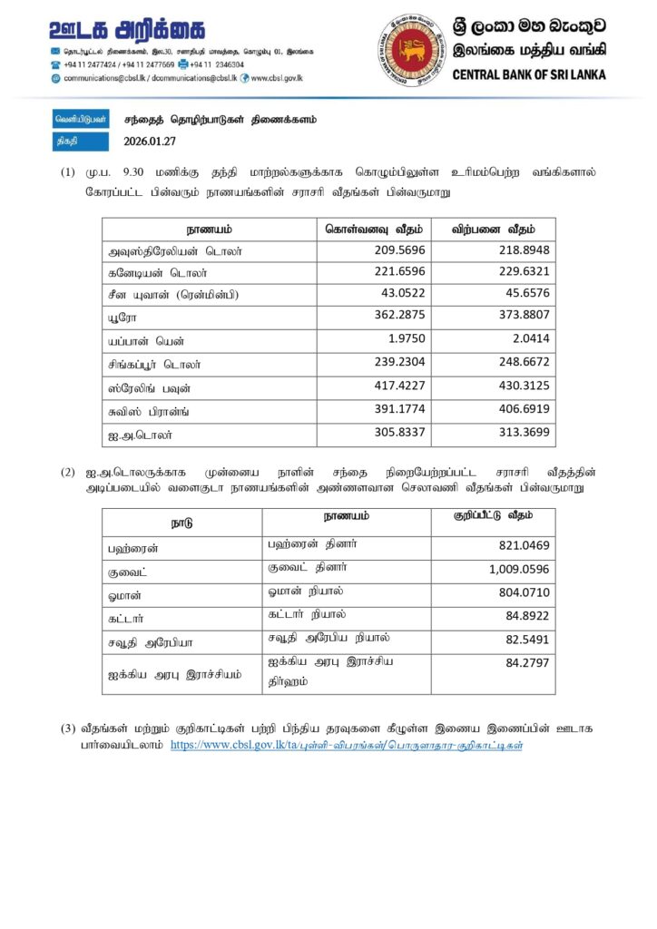 இலங்கை மத்திய வங்கி இன்று (27.01.2026) வெளியிட்டுள்ள நாணய மாற்று விகிதத்தின் அடிப்படையில்,