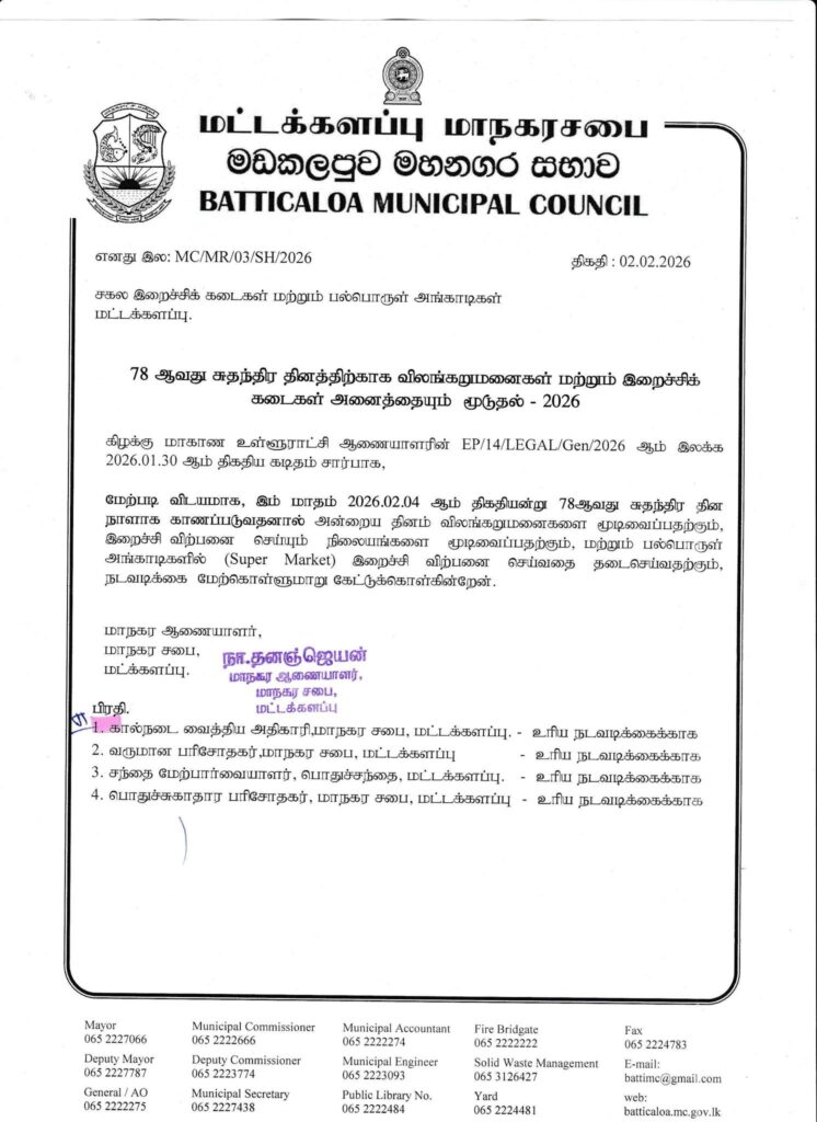 அதன்படி கிழக்கு மாகாண உள்ளூராட்சி ஆணையாளரின் EP/14/LEGAL/Gen/2026 ஆம் இலக்க கடிதத்தின் பிரகாரம் நாட்டின் 78 ஆவது சுகந்திரத்தினத்தை முன்னிட்டு மட்டக்களப்பு மாநகரசபை எல்லைக்கு உட்பட்ட விலங்கறுமனைகளை மூடிவைப்பதற்கும், இறைச்சி விற்பனை செய்யும் நிலையங்களை மூடிவைப்பதற்கும் மற்றும் பல்பொருள் அங்காடிகளில் (Super Market) இறைச்சி விற்பனை செய்வதை தடைசெய்வதற்கும், நடவடிக்கை மேற்கொள்ளுமாறு மட்டக்களப்பு மாநகரசபை தெரிவித்துள்ளது.