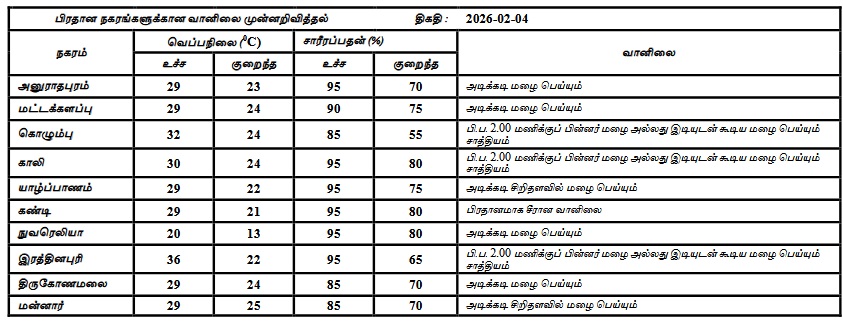 2026 பெப்ரவரி 05 ஆம் திகதிக்கான வானிலை முன்னறிவிப்பு 2026 பெப்ரவரி 05 ஆம் திகதி அதிகாலை 05.30 மணிக்கு வெளியிடப்பட்டது.