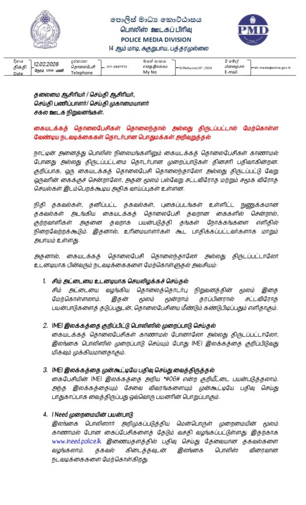 கையடக்க தொலைபேசிகள் தொலைந்தால் அல்லது திருடப்பட்டால் மேற்கொள்ள வேண்டிய நடவடிக்கைகள் தொடர்பாக இலங்கை பொலிஸ் திணைக்களம் பொதுமக்களுக்கு விளக்கம் அளித்துள்ளது.